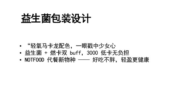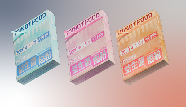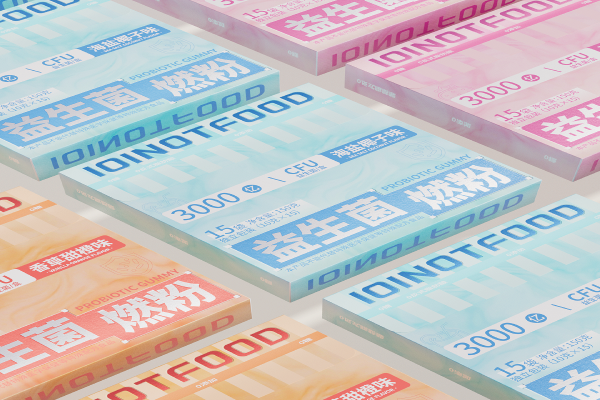 • “这款益生菌燃粉包装用了马卡龙渐变色,货架上特别显眼~ 一眼就能看到‘3000 低卡’‘益生菌’的核心卖点, 年轻人拿起来就知道是‘能瘦还健康’的代餐,不用多解释!”