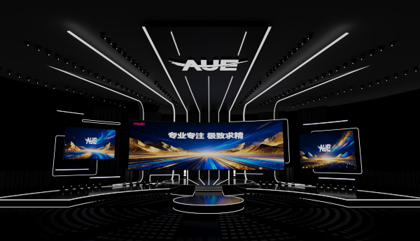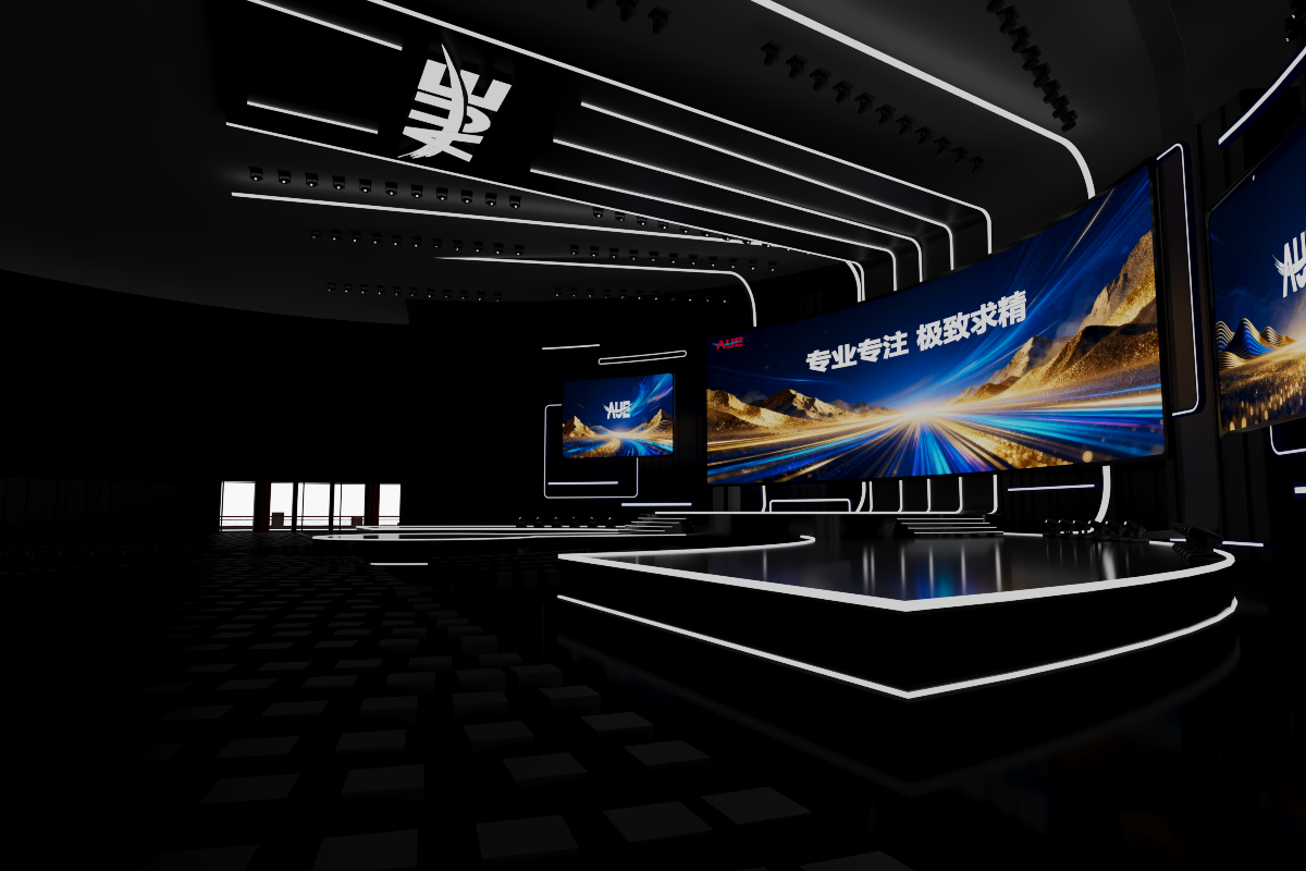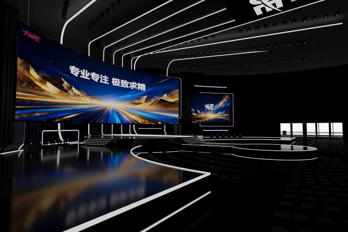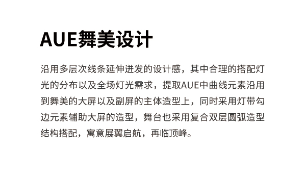 <舞台设计>沿用多层次线条延伸迸发的设计感,其中合理的搭配灯光的分布以及全场灯光需求,提取AUE中曲线元素沿用到舞美的大屏以及副屏的主体造型上,同时采用灯带勾边元素辅助大屏的造型,舞台也采用复合双层圆弧造型结构搭配,寓意展翼启航,再临顶峰
