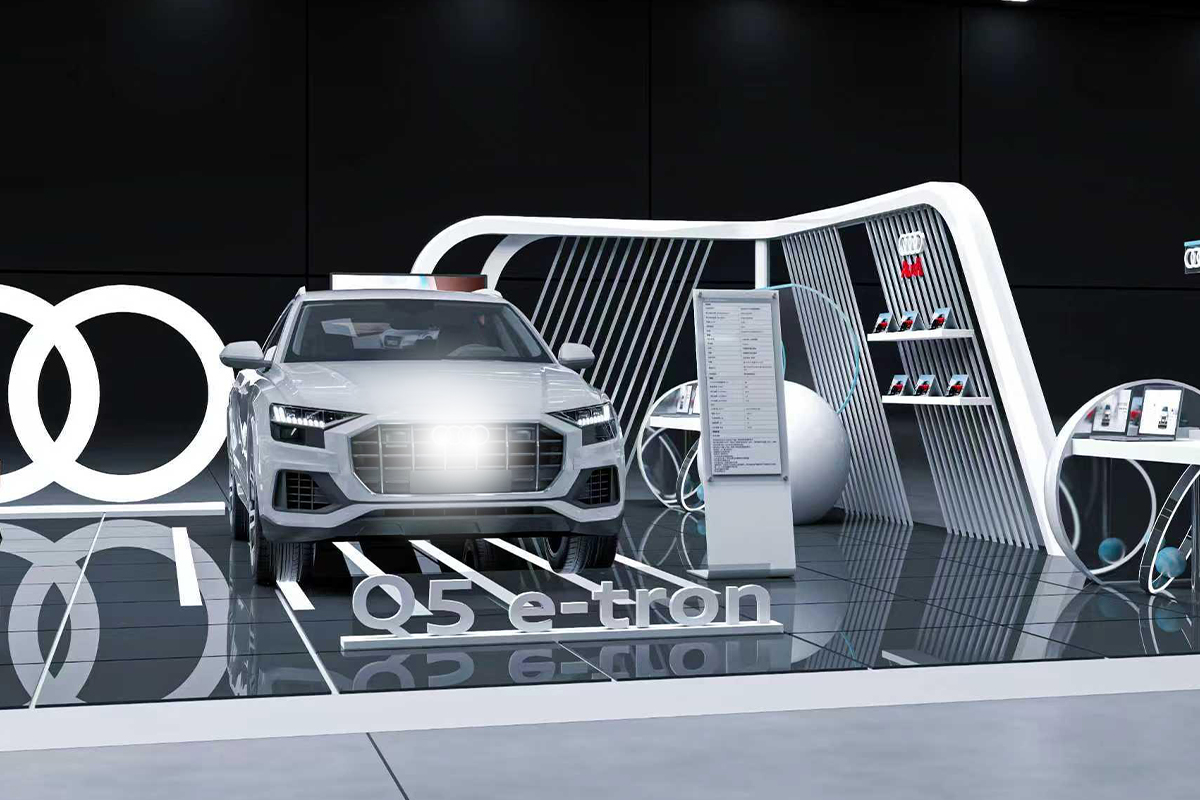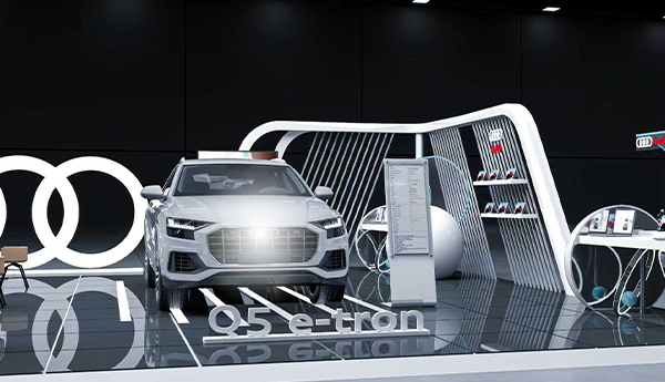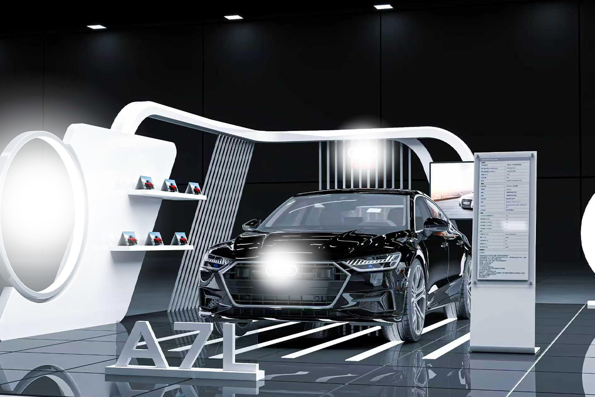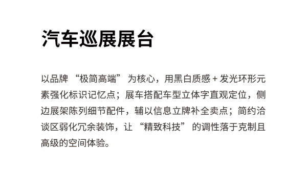 • 以品牌"极简高端"为核心,用黑白质感+发光环形元素强化标识记忆点;展车搭配车型立体字直观定位,侧边展架陈列细节配件,辅以信息立牌补全卖点;简约洽谈区弱化冗余装饰,让"精致科技"的调性落于克制且高级的空间体验。