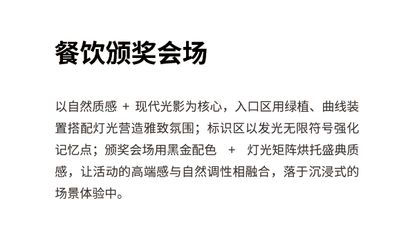 以自然质感+现代光影为核心,入口区用绿植、曲线装置搭配灯光营造雅致氛围;标识区以发光无限符号强化记忆点;颁奖会场用黑金配色+灯光矩阵烘托盛典质感,让活动的高端感与自然调性相融合,落于沉浸式的场景体验中。