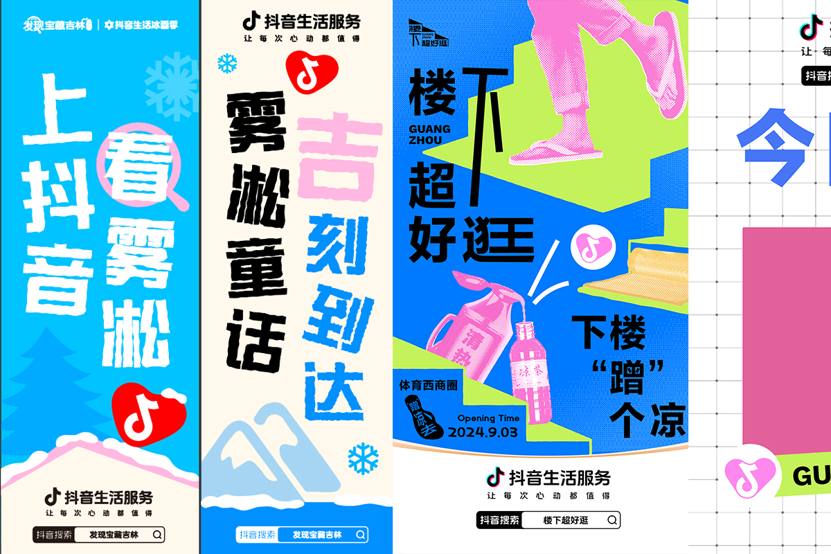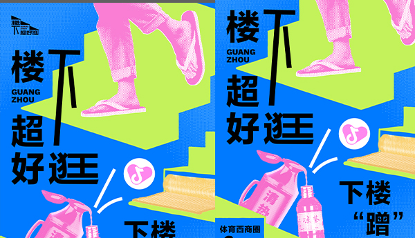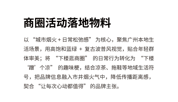 以"城市烟火+日常松弛感"为核心,聚焦广州本地生活场景,用高饱和蓝绿+复古波普风视觉,贴合年轻群体审美;将"下楼逛商圈"的日常行为转化为"下楼'蹭'个凉"的趣味梗,结合凉茶、拖鞋等地域生活符号,把品牌信息融入市井烟火气中,降低传播距离感,契合"让每次心动都值得"的品牌主张。