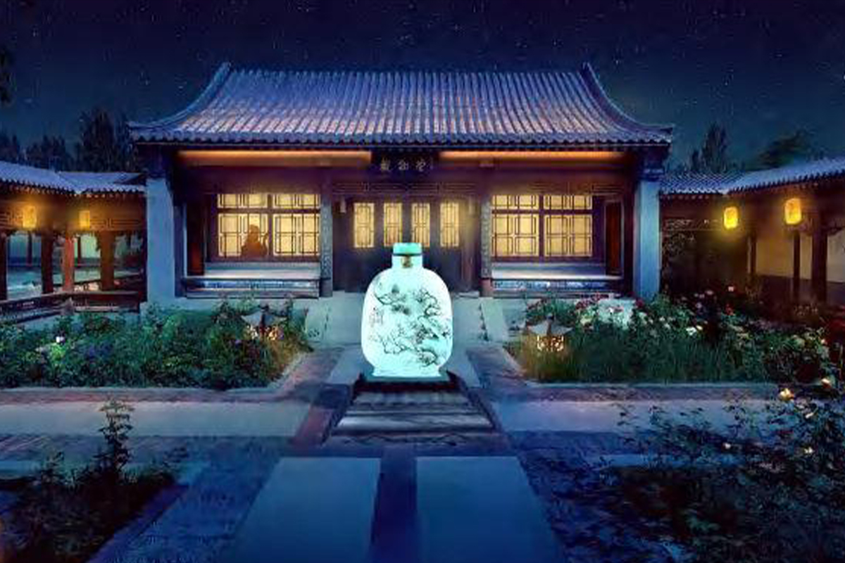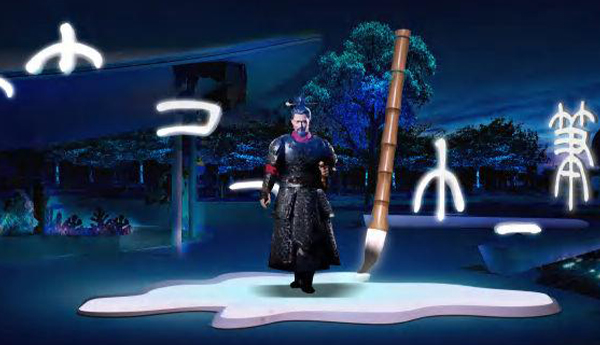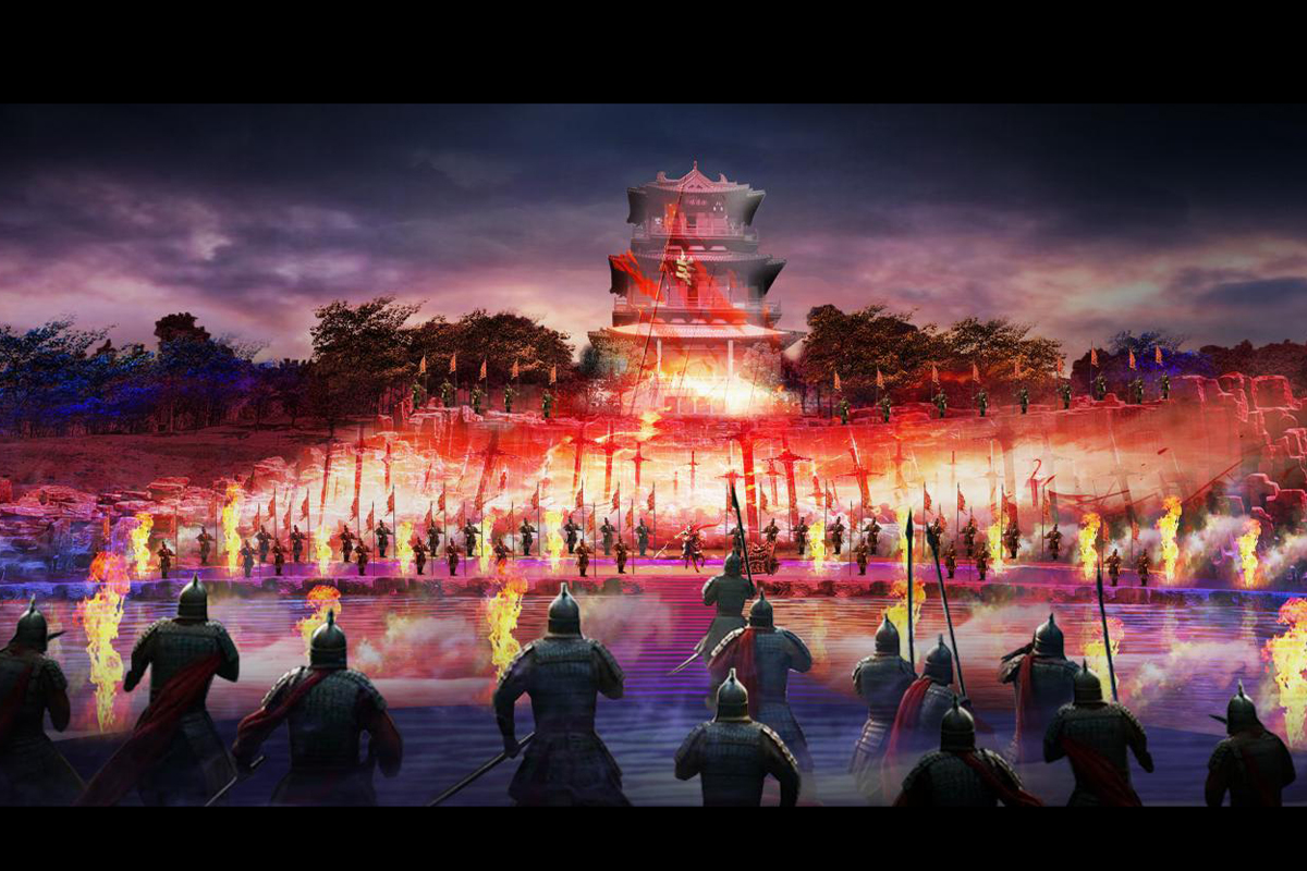 以"古意新境虚实共生" 为核心,将传统国元素(古建筑、书法、器物)与现代数字光影结合:前序场景用红焰、甲胄、楼阁构建"古战史诗感",后序转用荧光书法、巨型毛笔、发光瓷瓶等装置,把国风符号转化为沉浸式互动载体。
