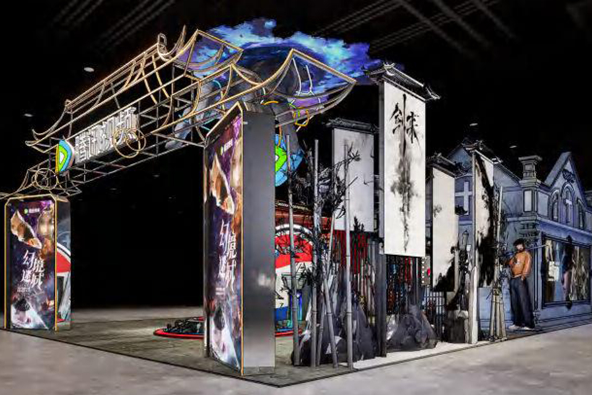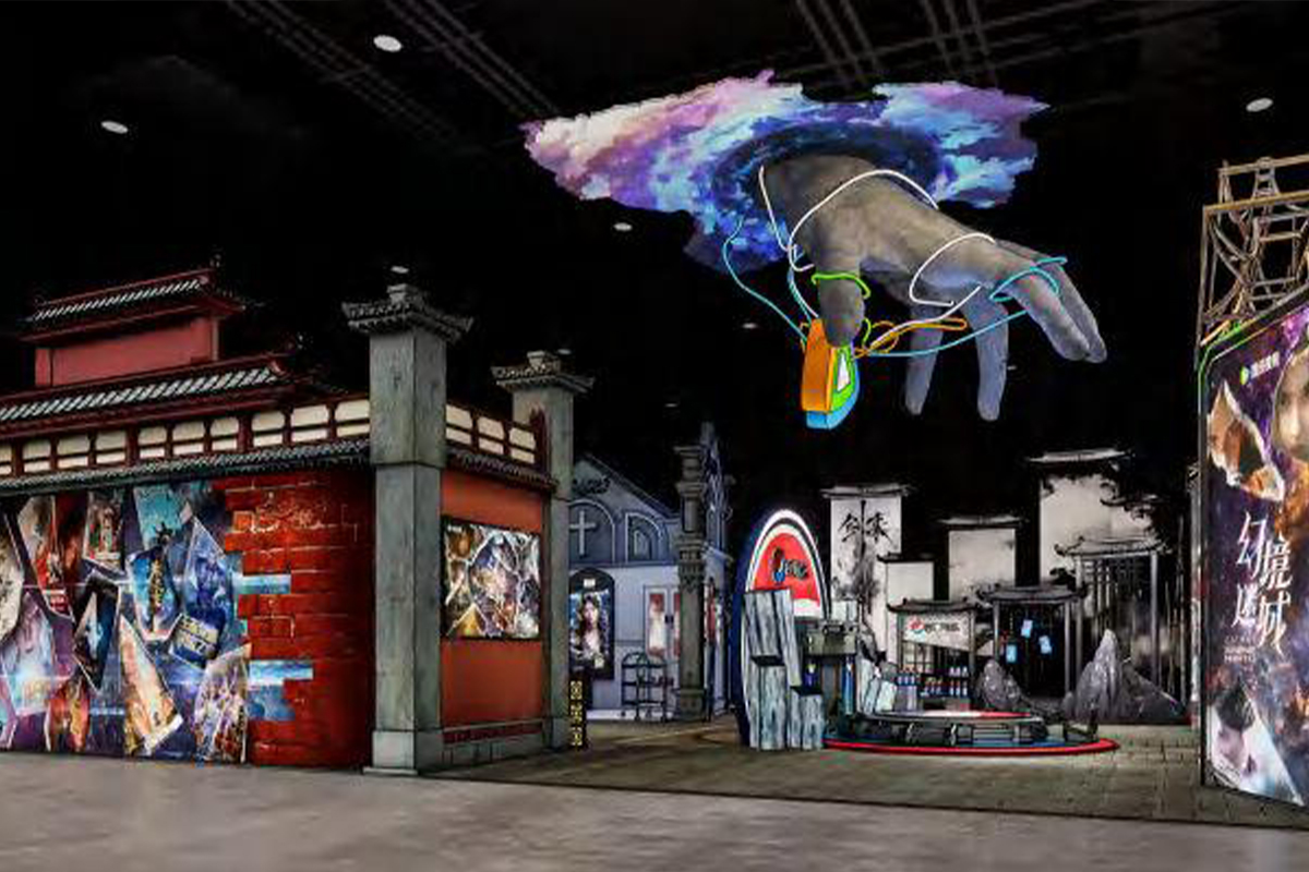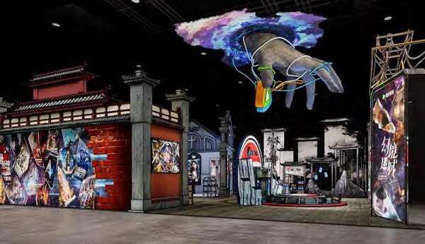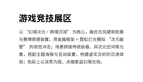• 以"幻境次元.跨域沉浸"为核心,融合古风建筑轮廓与赛博质感装置,用金属框架+霓虹灯光模拟"次元破壁"的视觉冲击;场景拼接传统街巷、异次元空间等元素,搭配主题海报与互动装置,构建虚实交织的沉浸体验;色彩上以深黑为底,点缀紫蓝幻境光效。
