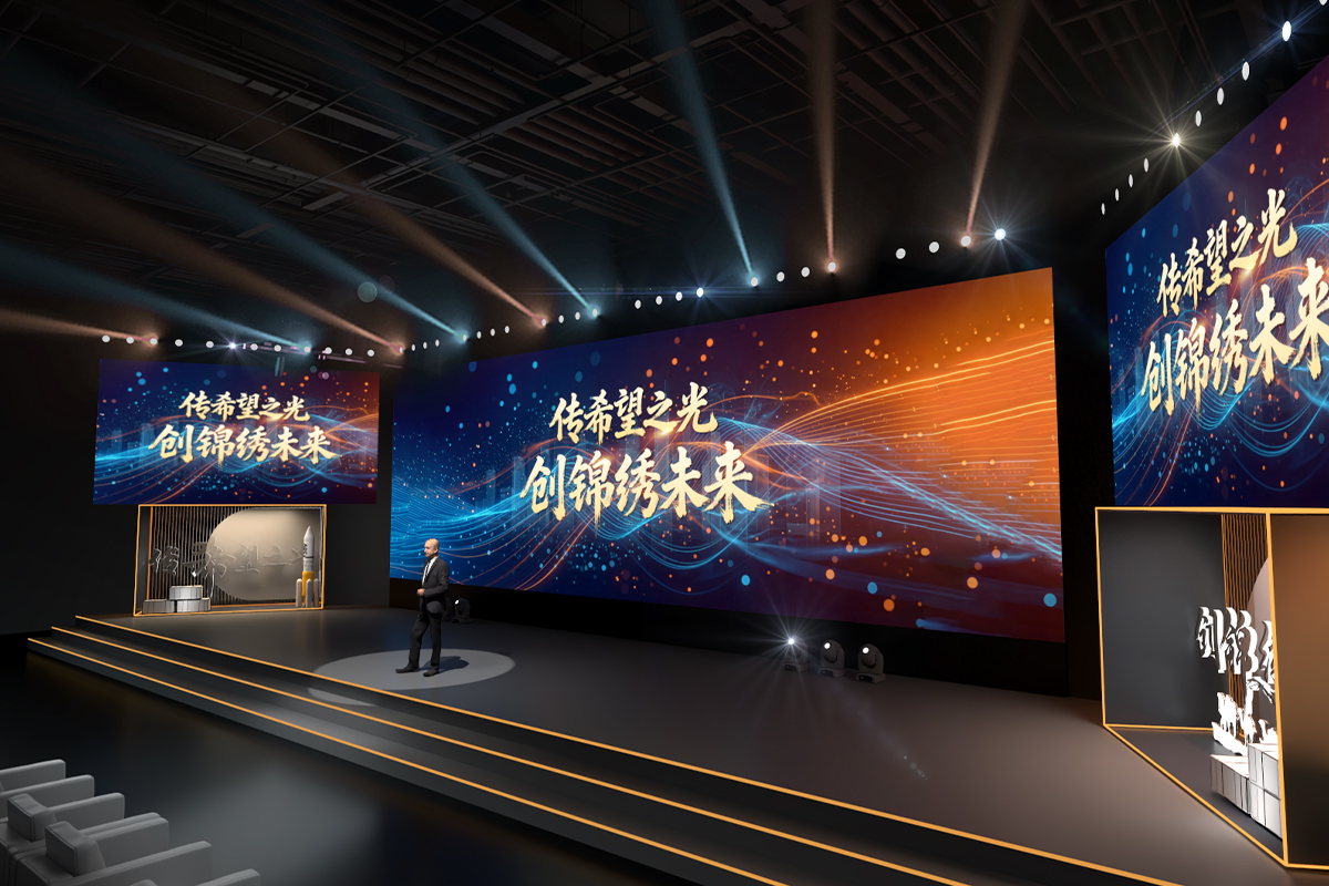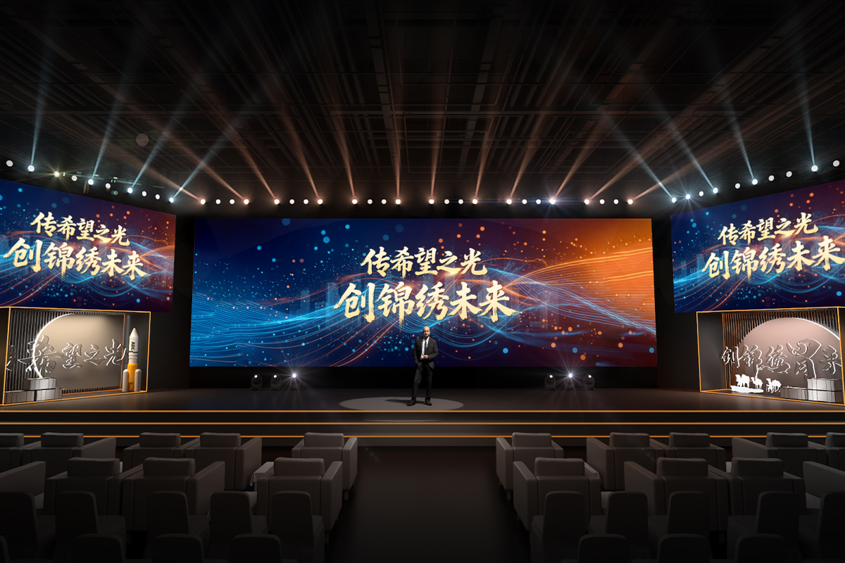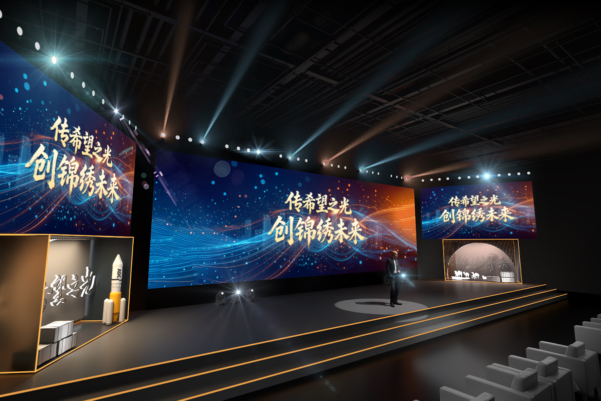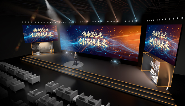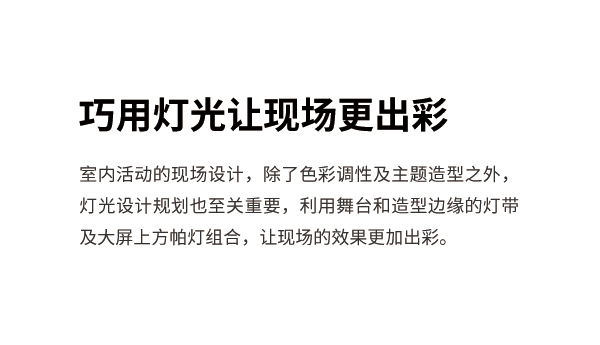<展台设计><舞台设计>室内活动的现场设计,除了色彩调性及主题造型之外,灯光设计规划也至关重要,利用舞台和造型边缘的灯带及大屏上方帕灯组合,让现场的效果更加出彩。