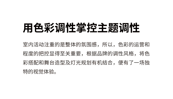 <展位设计><站台设计>室内活动注重的是整体的氛围感,所以,色彩的运营和程度的把控显得至关重要,根据品牌的调性风格,将色彩搭配和舞台造型及灯光规划有机结合,便有了一场独特的视觉体验。