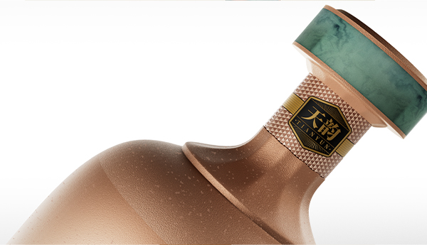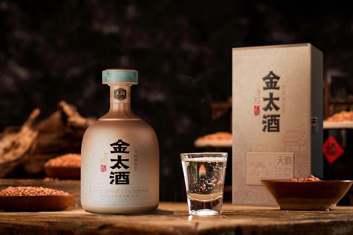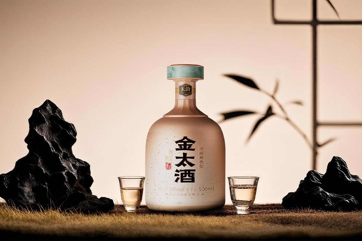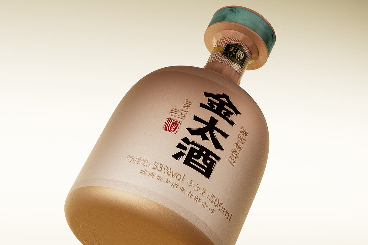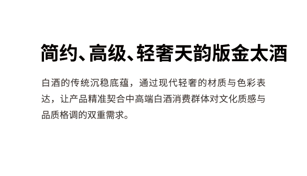 <酒瓶设计>这款金太酒包装以 “传统酒文化 + 轻奢质感” 为核心调性,瓶身采用浅金与暖米色渐变的细腻质感营造高端氛围,翡翠绿瓶盖则以点睛的贵气色彩提升格调;主视觉中 “金太酒” 厚重黑体字样强化品牌辨识度,“浓酱兼香型” 清晰标注品类,“天韵” 标识增添文化韵味,搭配背景枯木与暖橙底色