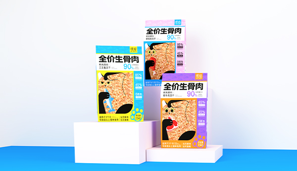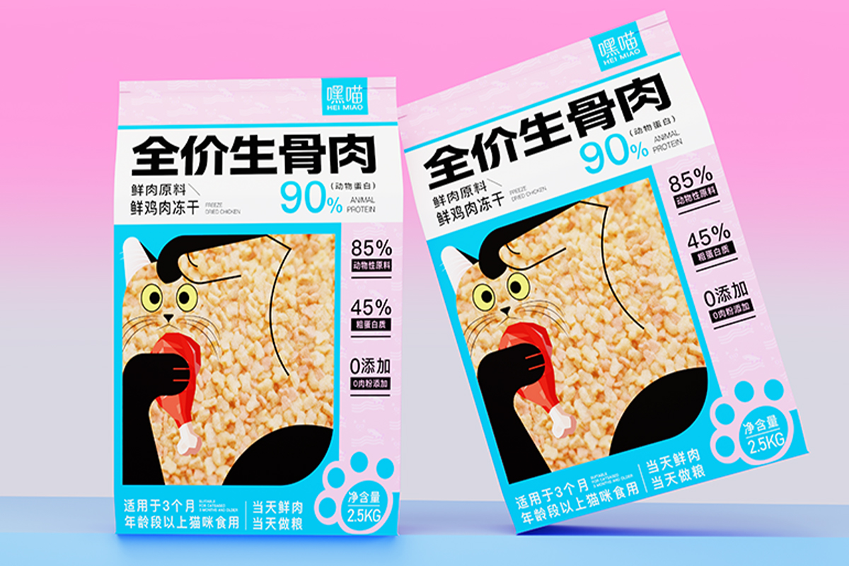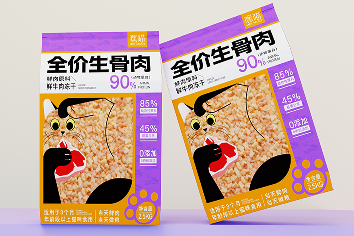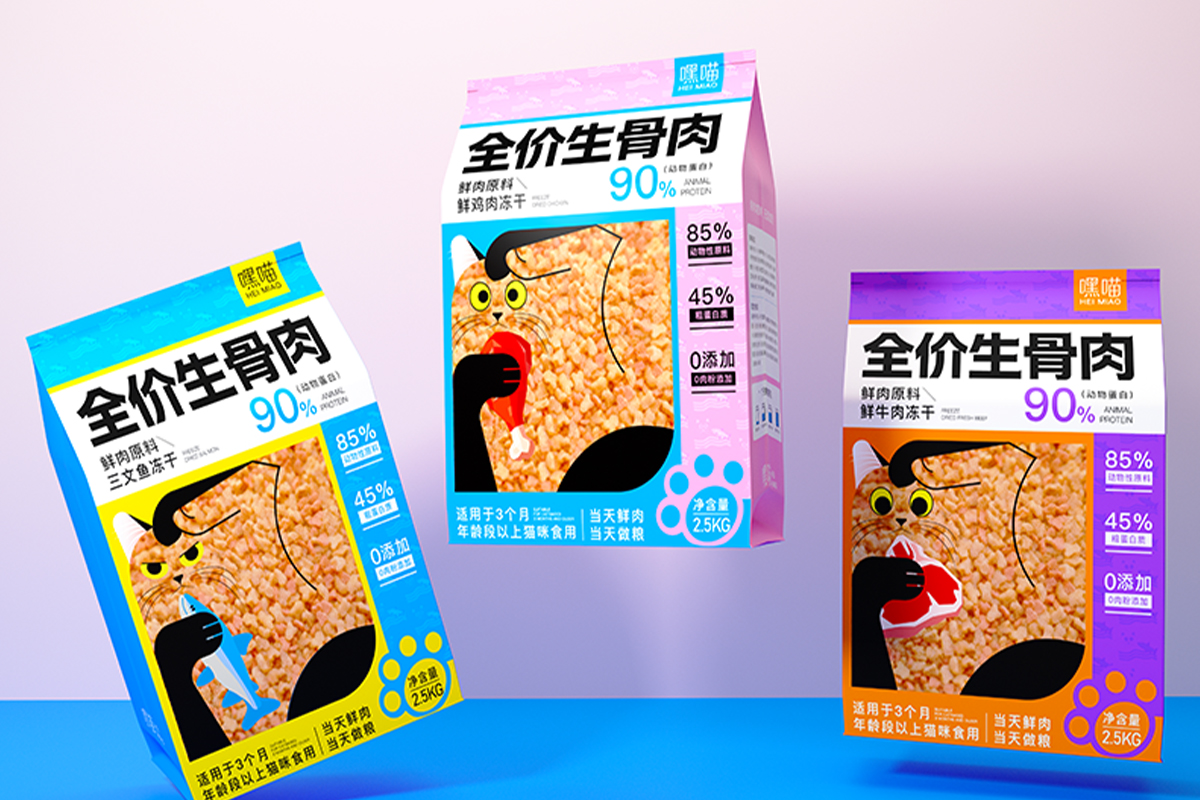 • <猫粮包装设计>猫咪主视觉设计:表情:眉头紧锁 +瞪圆双眼,嘴角微抿,胡须上扬呈警惕状,传递“不准抢我饭”的专 属占有欲;姿态:坐姿挺胸,前爪紧紧抱住三文鱼.