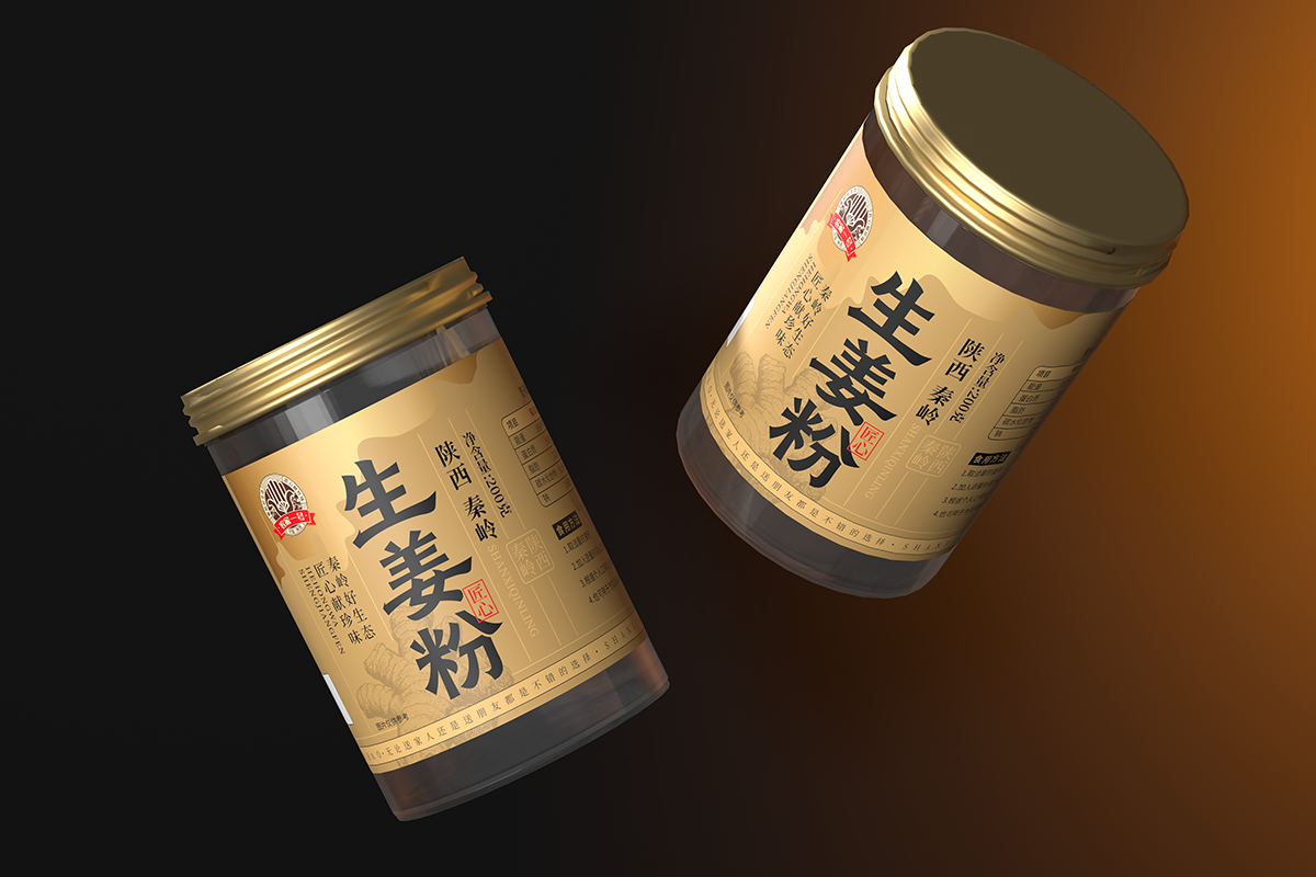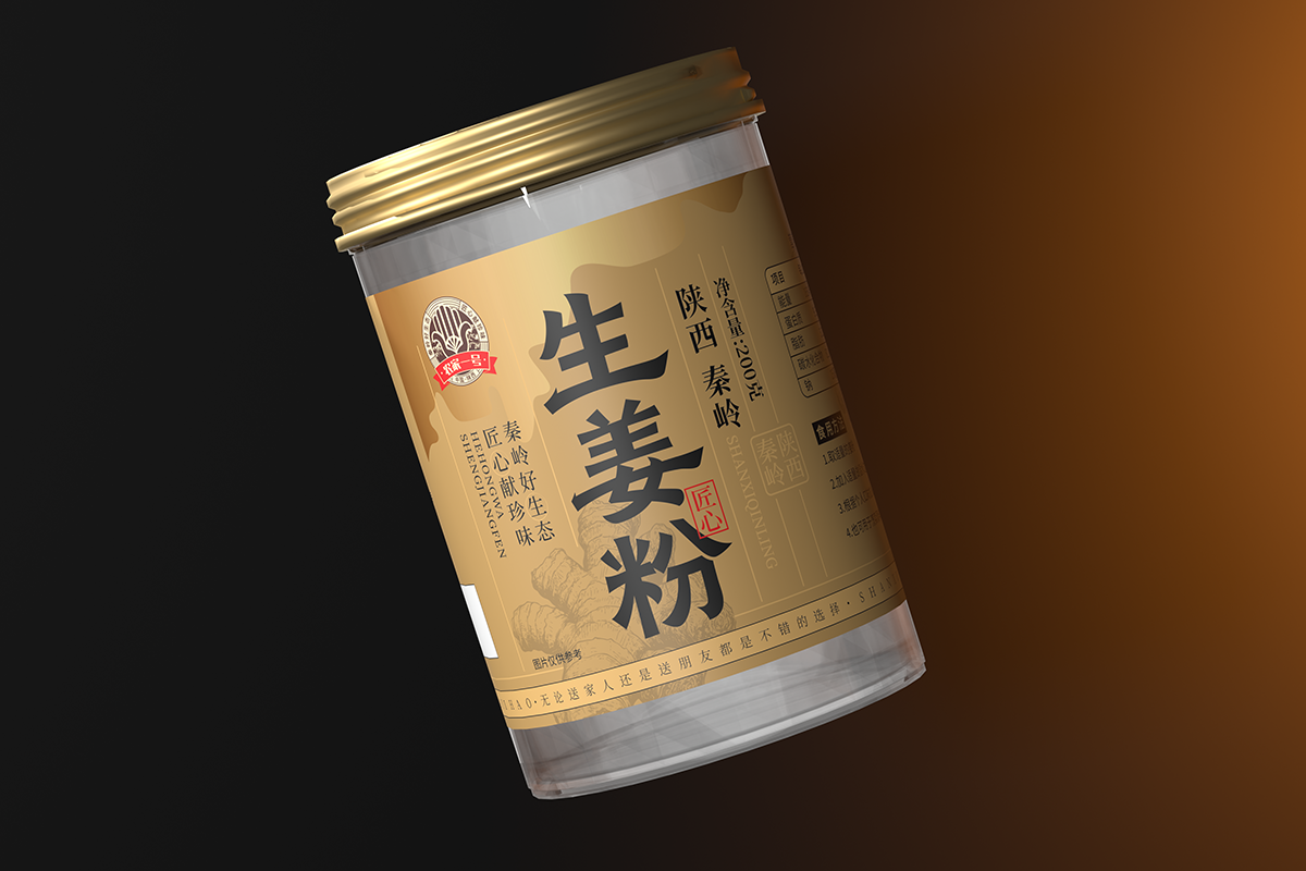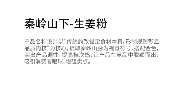 <瓶贴设计>产品名称设计以“传统韵致锚定食材本真,形制规整彰显品质内核”为核心,提取秦岭山脉为视觉符号,搭配金色突出产品调性,提高档次感,让产品在竞品中脱颖而出,吸引消费者眼球,增强卖点。