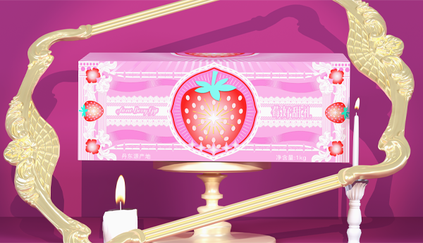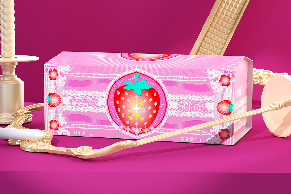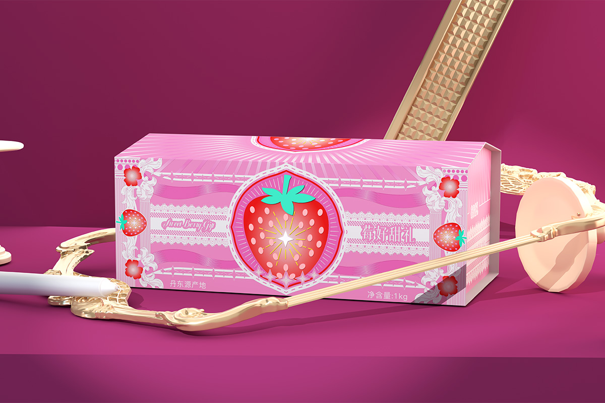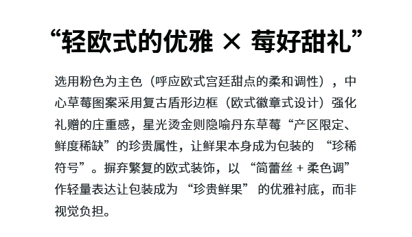 选用粉色为主色(呼应欧式宫廷甜点的柔和调性),中心草莓图案采用复古盾形边框(欧式徽章式设计)强化礼赠的庄重感,星光烫金则隐喻丹东草莓"产区限定、鲜度稀缺"的珍贵属性,让鲜果本身成为包装的"珍稀符号"。摒弃繁复的欧式装饰,以"简蕾丝+柔色调"作轻量表达让包装成为"珍贵鲜果"的优雅衬底,而非视觉负担。